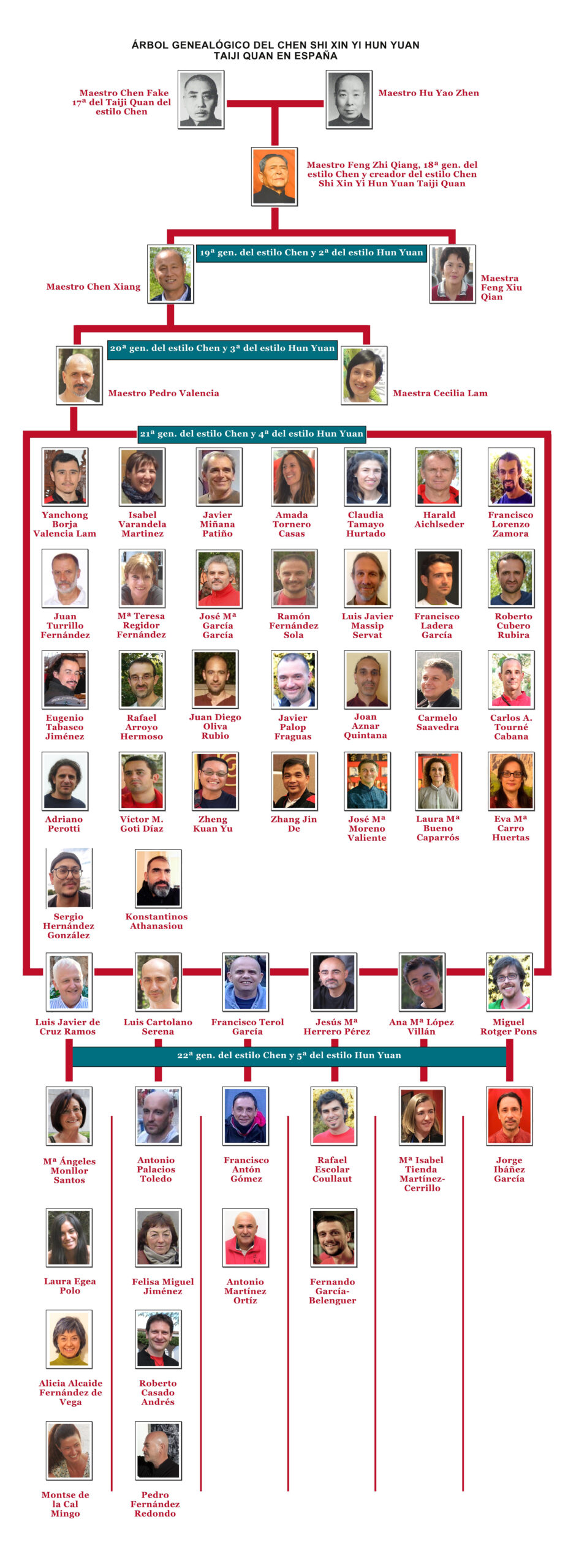 El maestro Feng Zhi Qiang es discípulo directo por ceremonia de los difuntos maestros Chen Fake y Hu Yiao Zhen. Para los practicantes del Tai Chi Chuan, el nombre del maestro Chen Fake ya es todo un mito. Era el 17ª generación del linaje Chen y uno de los maestros más legendarios por su destreza marcial. El maestro Hu Yiao Zhen poseía conocimientos muy profundos sobre las prácticas taoístas del cultivo de la energía. Pertenecía también a la afamada Escuela Secreta de la Puerta de Dragón. Era médico-acupuntor de profesión. Fue pionero en implantar los trabajos energéticos como tratamientos coadyuvantes en los centros sanitarios gubernamentales. Definió a estos trabajos energéticos con este nombre contemporáneo que todos conocemos como el Qi Qong. Por lo tanto, recibió el apodo de “el Padre del Qi Qong”.